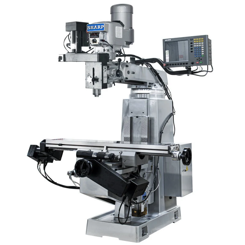 This is a simple, easy to use 3 axis CNC control vertical mill. Ball screws and servo drives are installed for longitudinal and cross travel. 3 axis Digital Readout System are installed on the table, saddle and quill. The Millpwr G2 CNC has G code and conversational type programming. The CNC system is built on the top quality SHARP vertical mills frame.