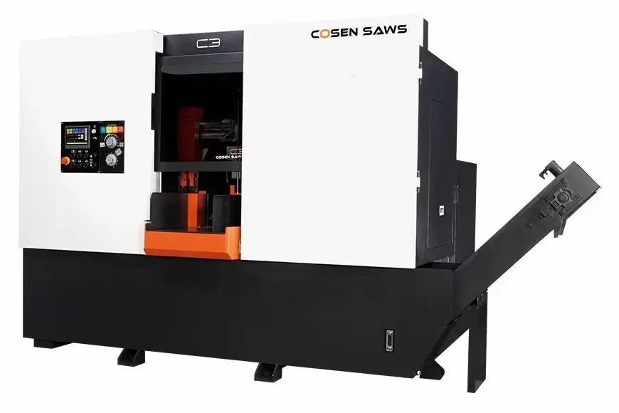 With its rigid structure, a 7.5 HP (5.62 kw) inverter drive, 41 mm wide blade, and easy to use controls, Cosen's C3 band saw is compact in size, yet fits the need of any job shops, machine shops, or demanding production shops.
