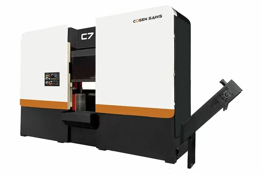 This 700 x 660 mm fully enclosed column type automatic band saw features Cosen's Smart NC+ control system, and it offers automatic first (trim) cut, a customizable material feed & speed database, plus storage and queue of up to 100 jobs. While controlled hydraulically, the saw frame rides on linear guide ways (rails), which ensures the smoothest feeding and highest precision guide system available today.
